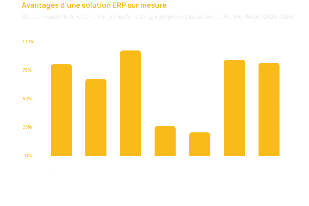 Un ERP sur mesure offre des avantages majeurs en matière d’adaptation aux processus métiers. Conçu spécifiquement pour votre activité, il permet une personnalisation totale afin d’aligner parfaitement l’outil avec vos workflows uniques. Chaque module, fonctionnalité ou interface peut être ajusté pour refléter vos méthodes de travail réelles, sans imposer de changements contraignants. Cette adéquation permet d’automatiser les tâches récurrentes, réduisant les erreurs et les pertes de temps. En centralisant les données et en fluidisant les échanges d’informations, un ERP sur mesure contribue directement à l’amélioration de la productivité et à une prise de décision plus rapide. Sa scalabilité est un atout essentiel. L’outil peut évoluer avec votre entreprise, en intégrant de nouveaux besoins, utilisateurs ou fonctionnalités. C’est un investissement durable, capable d’accompagner efficacement la croissance et les mutations de votre structure dans le temps.
