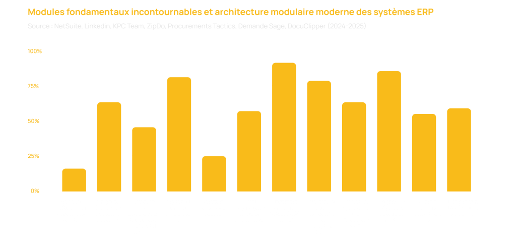 Les modules ERP modernes couvrent désormais un spectre très large, allant de la finance et de la comptabilité à la gestion de la production, de la supply chain, du CRM, des achats, des RH, de l’e-commerce ou encore de la maintenance. En tout, plus de 15 domaines fonctionnels essentiels sont pris en charge, permettant aux entreprises de centraliser leurs processus et d’améliorer leur performance. Cette richesse est renforcée par l’existence de plus de 200 connecteurs d’intégrations, facilitant l’interopérabilité avec des outils spécialisés comme les WMS, CRM ou plateformes e-commerce. Grâce à cette modularité, chaque organisation peut configurer et personnaliser son ERP sur mesure en fonction de ses besoins métiers spécifiques. Ce marché est en pleine expansion, estimé à 50 milliards d’euros en 2025, avec 3 grands acteurs comme le SAP, Microsoft Dynamics et NetSuite qui concentrent à eux seuls près de 60% des parts de marché.