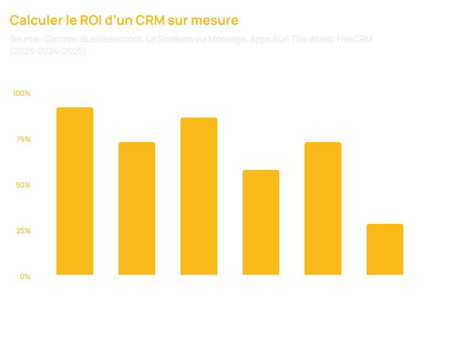 Le retour sur investissement (ROI) d’un CRM se calcule classiquement par la formule (Gains – Coûts) / Coûts x 100. On peut aussi analyser la période d’amortissement, la valeur actuelle nette (VAN) pour les projets à long terme, et le coût total de possession sur 5 ans, CRM standard contre CRM sur mesure.