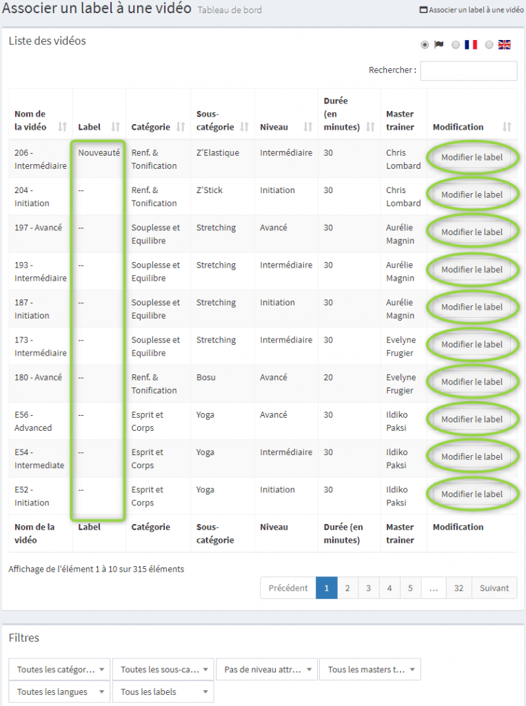 Le champ rechercher en haut à droite et les filtres en bas de pages vous permettent de rapidement retrouver les vidéos.