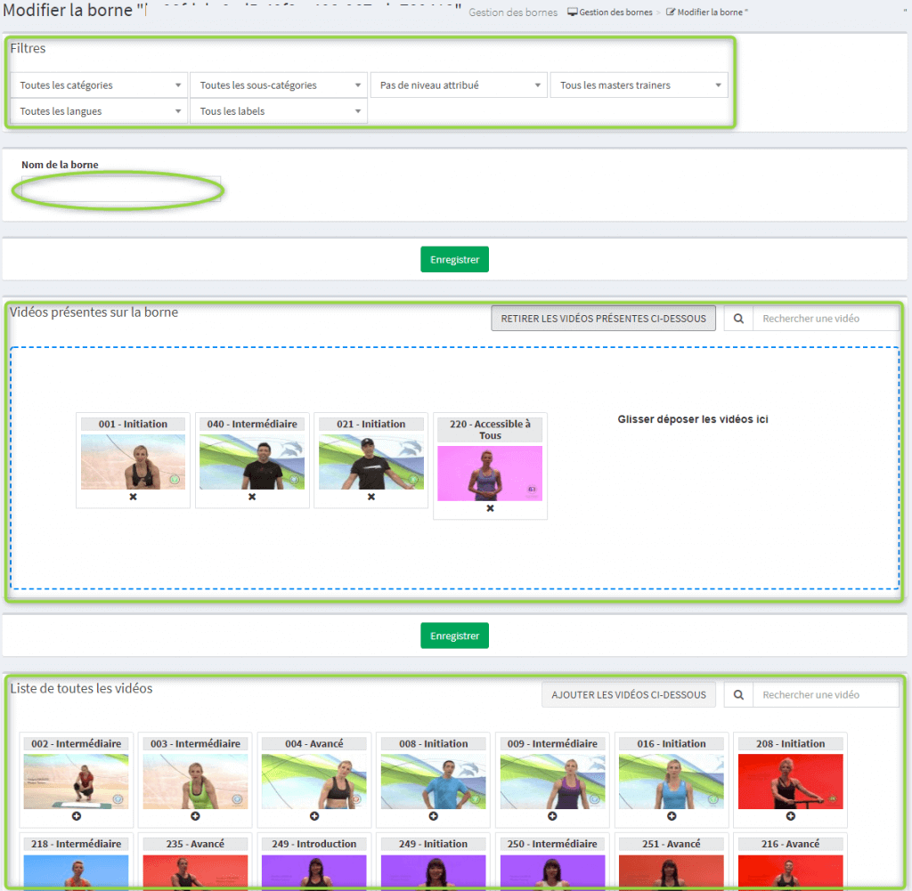 Pour modifier le nom de la borne, cliquez dans le champs texte sous « Nom de la borne » (par exemple: salle biking, salle généraliste, salle step, ..). Cliquez ensuite sur le bouton « Enregistrer » pour sauvegarder votre modification.
